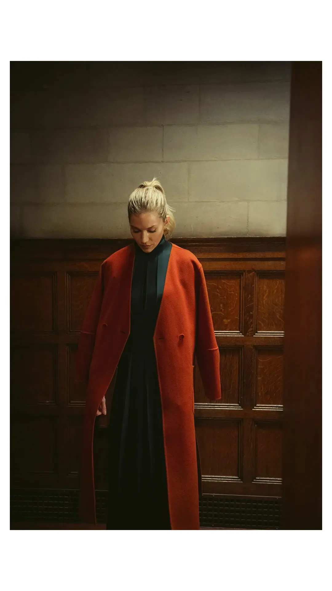 De grå og beige turtlenecks, som ellers ikke har været i modefront i mange år. Den klassiske kamelfrakke fra Max Mara (som alle i virkeligheden burde have i sit liv – den holder for evigt). Burberry-trenchcoaten. De lyse cremefarver, der går igen i hele garderoben. Og uldfrakken i smuk, brændt orange. Håret, der enten hænger løst eller er sat stramt op i en hestehalen. Og et touch af rød på læber og negle. Ikke knaldrød, men twistet, så det matcher resten.