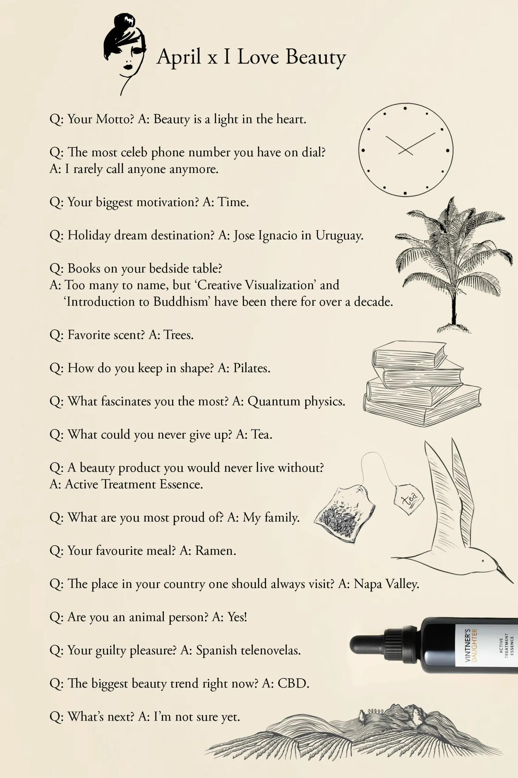Så mens vi ser frem til efterårets fine input, får du her muligheden for at lære April en smule bedre at kende. Vi har nemlig lavet en lille Q&A som hun har svaret på fra sit (virkelig fantastiske) hjem på vingården i Napa.