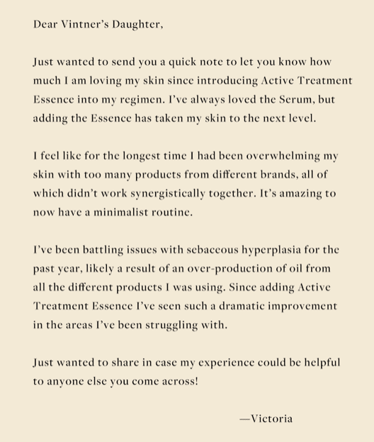 Derudover taler vi masser af fugt, naturligt stabiliseret C-vitamin, collagenboostende plante-stamceller, præ-og probiotika og genopbyggende mikroalger, der tilsammen vækker træt hud, mindsker pigmentforandringer og giver den dér synlige glød som Vintner’s Daughter er så kendt for.