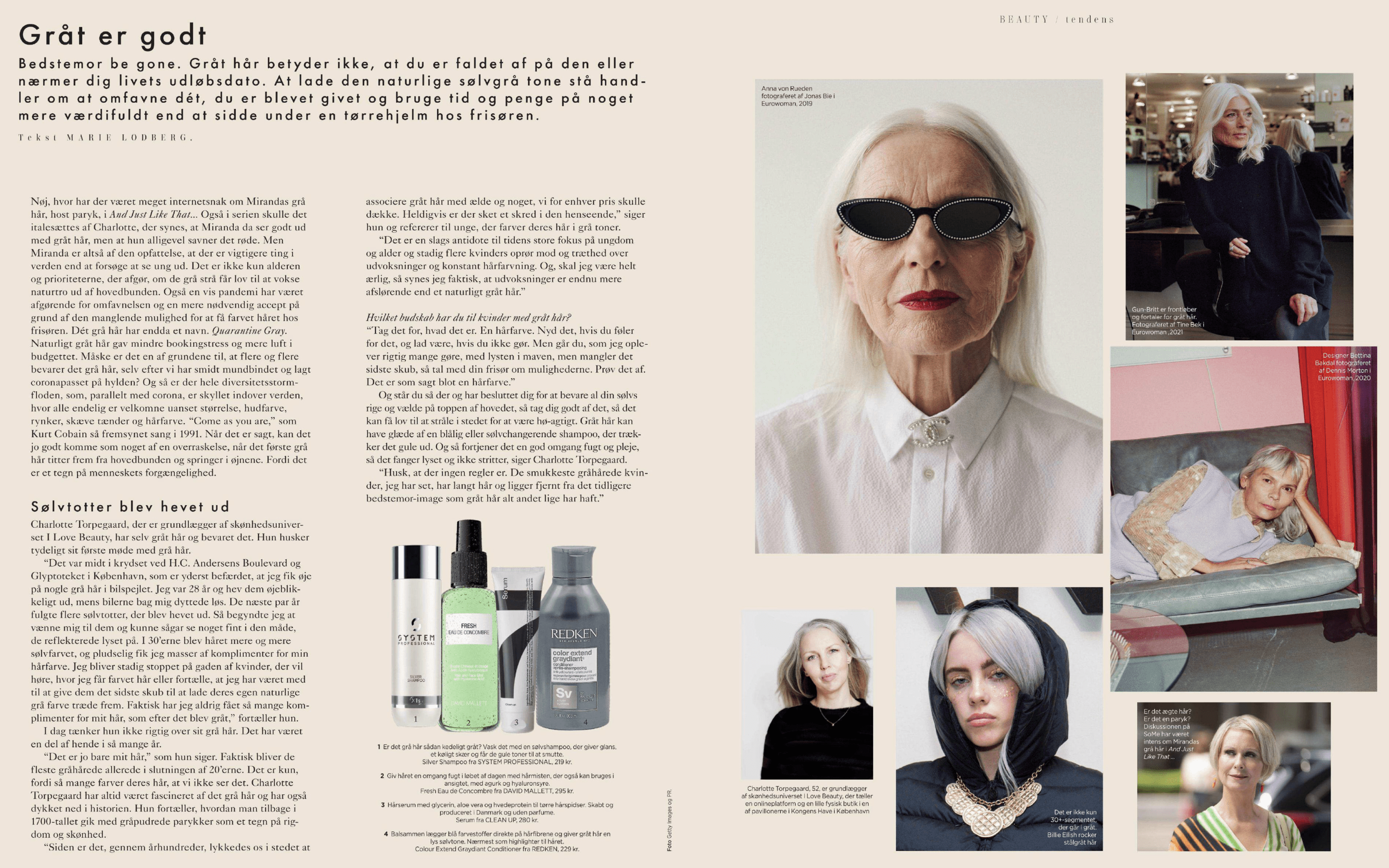 Det er ikke første gang, jeg er blevet interviewet om gråt hår (mit eget oftest) og garanteret heller ikke sidste. Da jeg skrev min første skønhedsbog, var det en helt naturlig ting for mig at tage gråt hår med som en del af den skønhedsverden, vi lever i. For hey, de fleste får altså de første grå hår allerede i slut-tyverne, så der er vitterlig ikke noget odiøst i det. Det var egentlig også min pointe i seneste nummer af Eurowoman, hvor jeg tog en snak med skønhedsredaktør Marie Lodberg om gråt hår.
