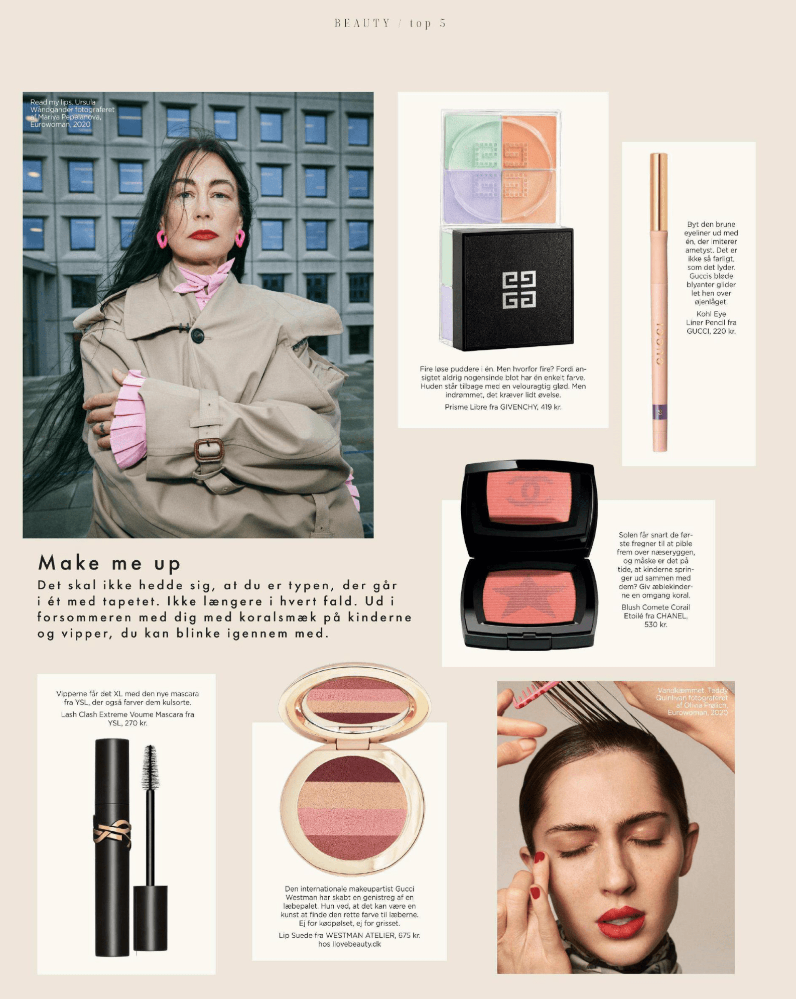 Den internationale makeupartist Gucci Westman har skabt en genistreg af en læbepalet. Sådan skriver Eurowoman i seneste nummer om Westman Ateliers Les Nudes. Den hypede læbepalette er nemlig på Eurowomans Beauty Top 5 for forsommeren og i virkelig godt selskab.