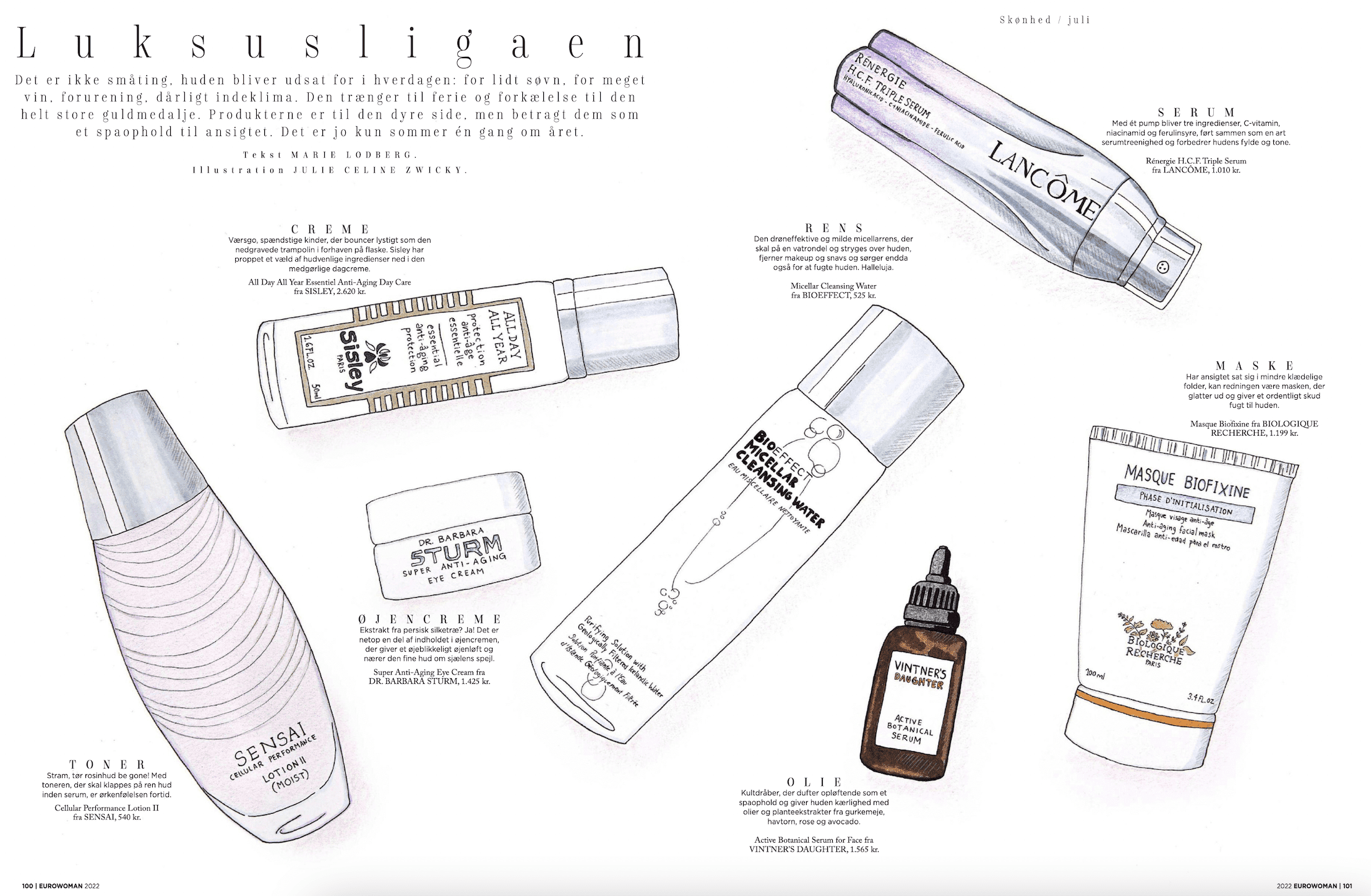 Kultdråber, der dufter opløftende som et spaophold og giver huden kærlighed med olier og planteekstrakter fra gurkemeje, havtorn, rose og avocado. Sådan skriver Eurowoman i deres nye udgave, hvor de anbefaler deres yndlingsprodukter, der ‘er som et spaophold til ansigtet’. Men det er ikke engang det fineste ved artiklen, prøv lige at tjekke de fantastiske illustrationer.