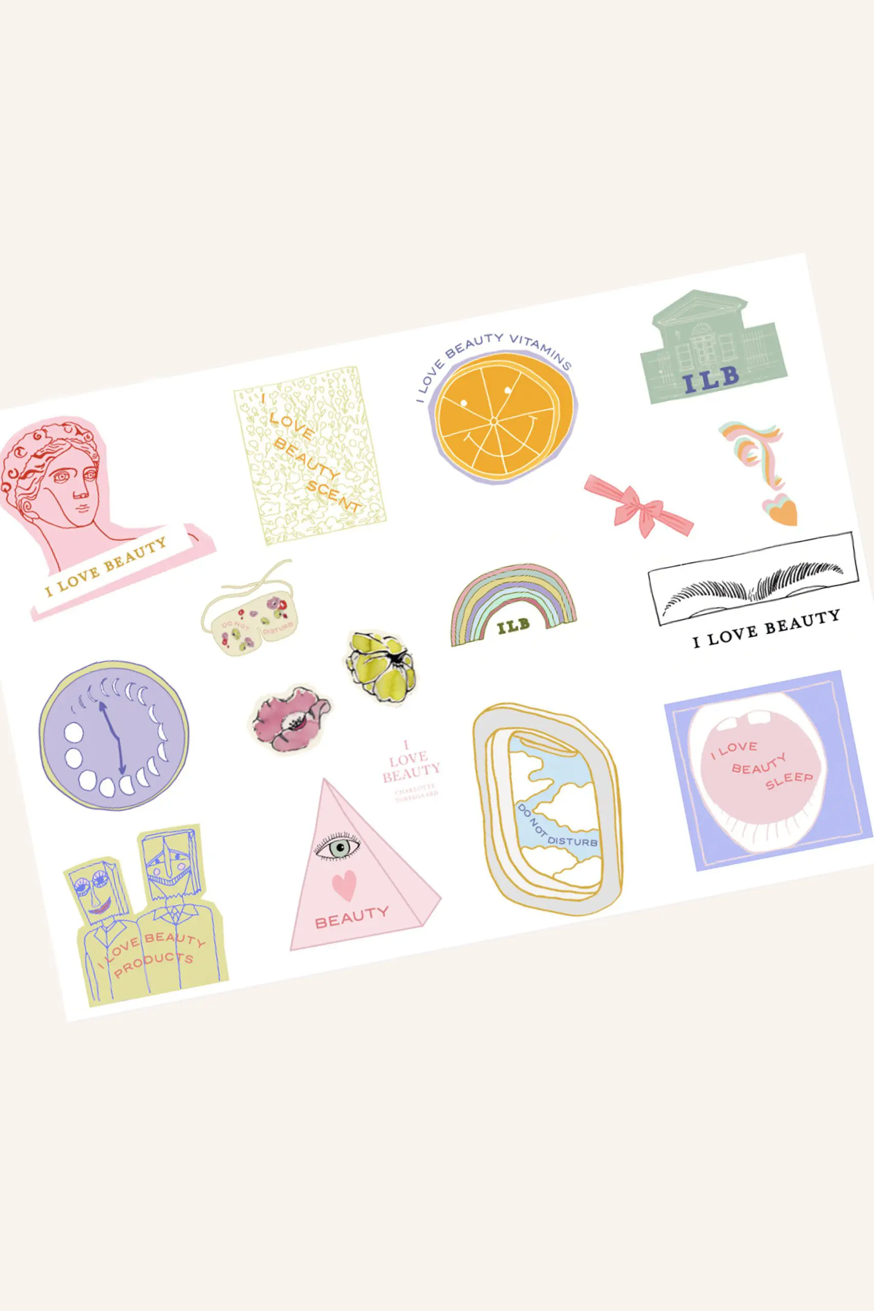Så nu har vi lavet det fineste beauty-stickerark og det er selvfølgelig ikke hvilke som helst stickers. Kigger du nøje efter, vil du kunne finde små hentydninger til de ting, vi elsker hos os. Fra månens faser og blomster fra Kongens Have til rejser, sløjfer, vitaminer, regnbuer og dufte. På stickersarket finder du også en græsk statue, en saftig appelsin, et stort gab og en lille bitte sovemaske. Og selvfølgelig også den lille skønhedspavillon.