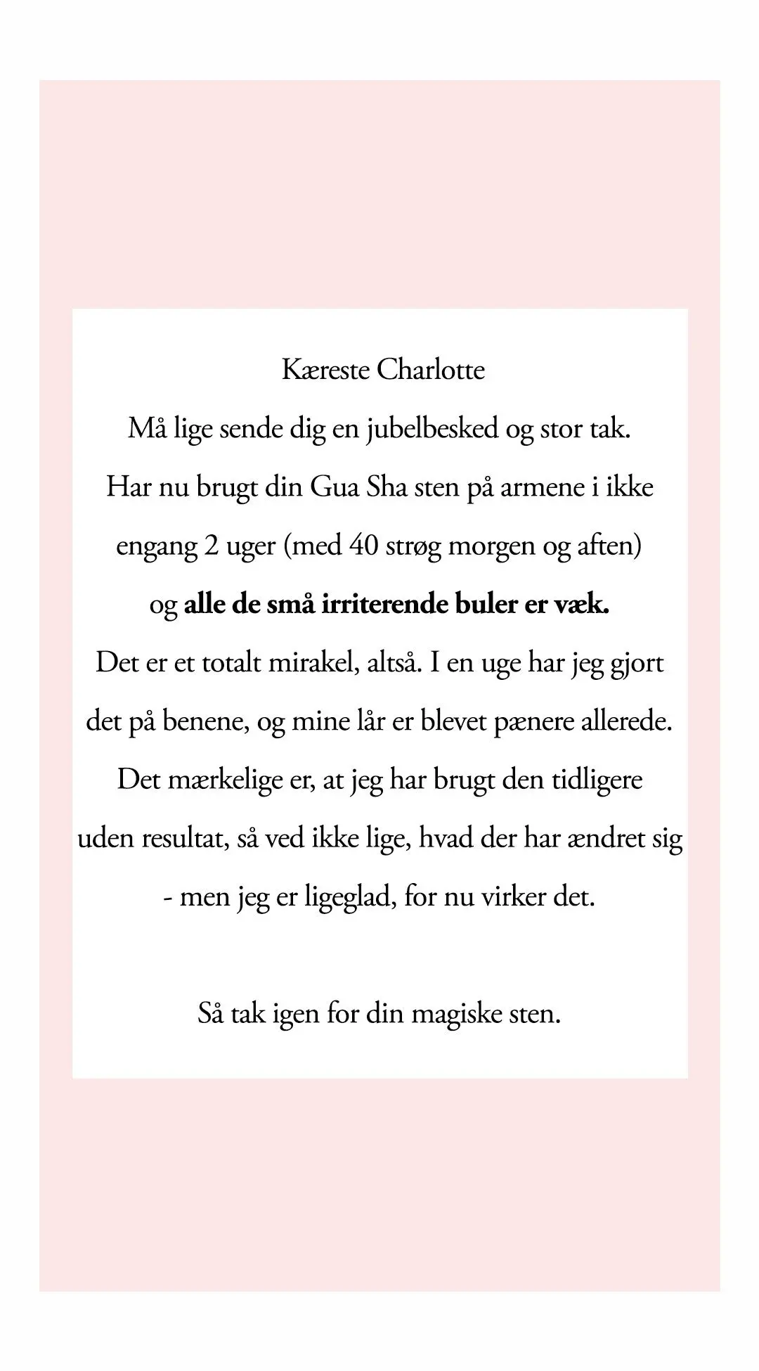‘Kæreste Charlotte, må lige sende dig en jubelbesked og stor tak. Har nu brugt din Gua Sha-sten på armene i ikke engang 2 uger (med 40 strøg morgen og aften) og alle de små irriterende buler er væk. Det er et totalt mirakel, altså. I en uge har jeg gjort det på benene og mine lår er blevet pænere allerede. Det mærkelige er, at jeg har brugt den tidligere uden resultat, så ved ikke lige, hvad der har ændret sig – men jeg er ligeglad for nu virker det’