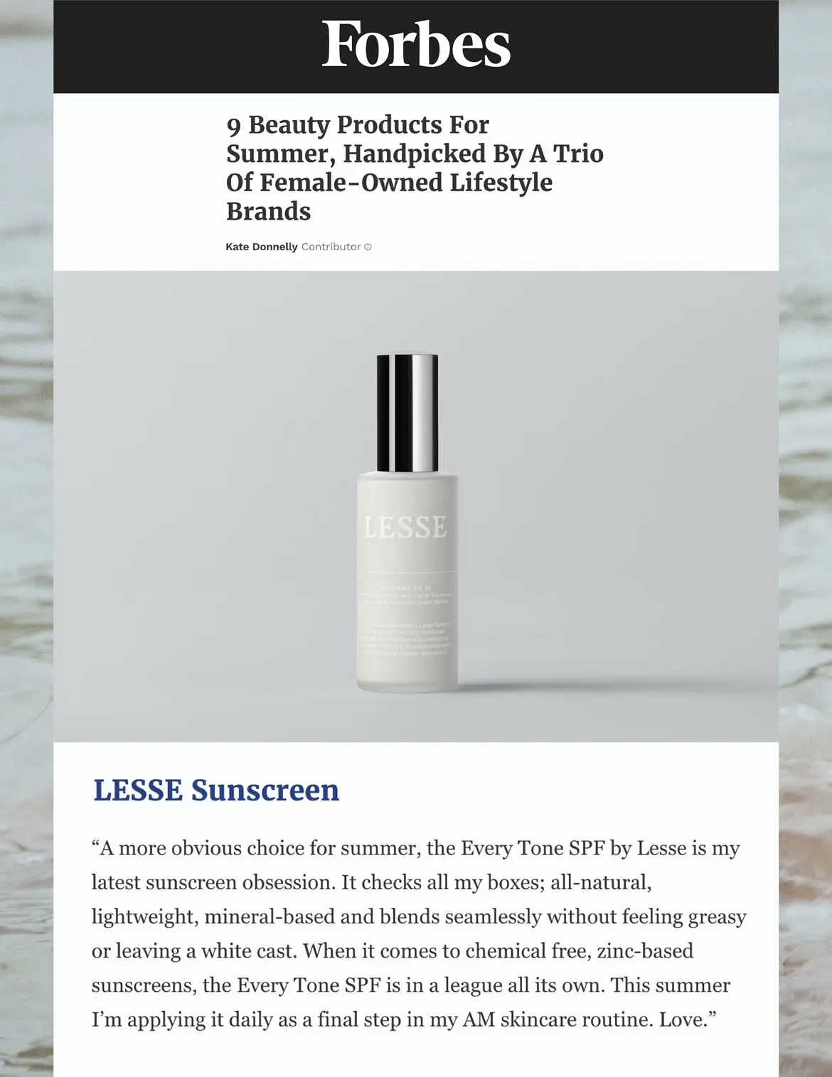 Sådan skrev Forbes for nylig om Lesse Every Tone SPF 30, som ikke kun beskytter mod solen, men også beskytter huden mod ældning med sin unikke blanding af antioxidanter, mineraler og australske superbær (Neada Deters, der står bag, er oprindeligt australsk, selv om hun for en del år tilbage flyttede først til New York og så til Californien).