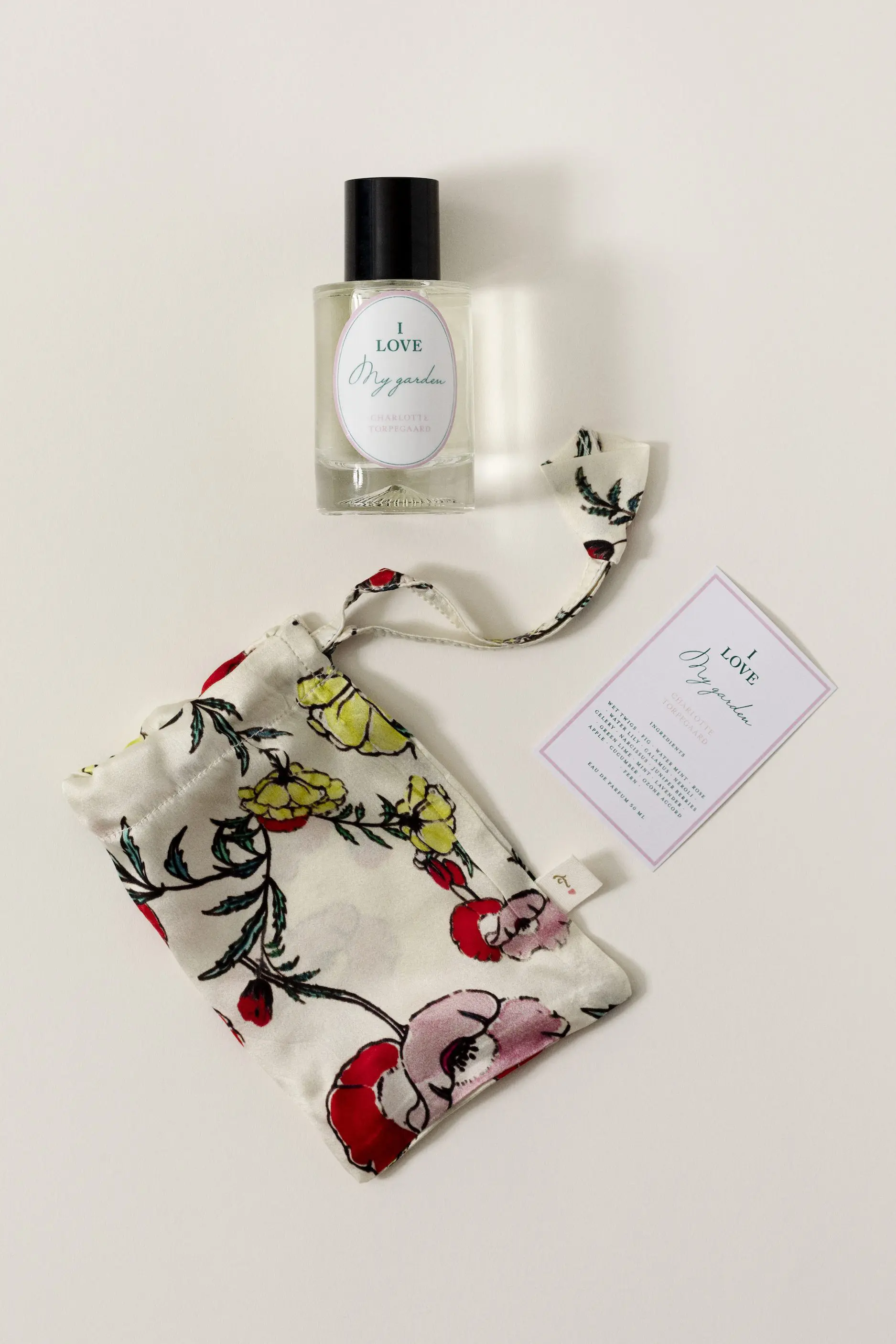‘Jeg forelskede mig ved første duft hovedkuls i Charlotte Torpegaards parfume I LOVE MY GARDEN. Hun har udviklet parfumen med noter, der findes i Kongens Have, som roser, lavendel og lilje. Jeg bor selv lige ved haven og elsker at have dens duft med mig. Jeg får stort set dagligt komplimenter for I LOVE MY GARDEN’
