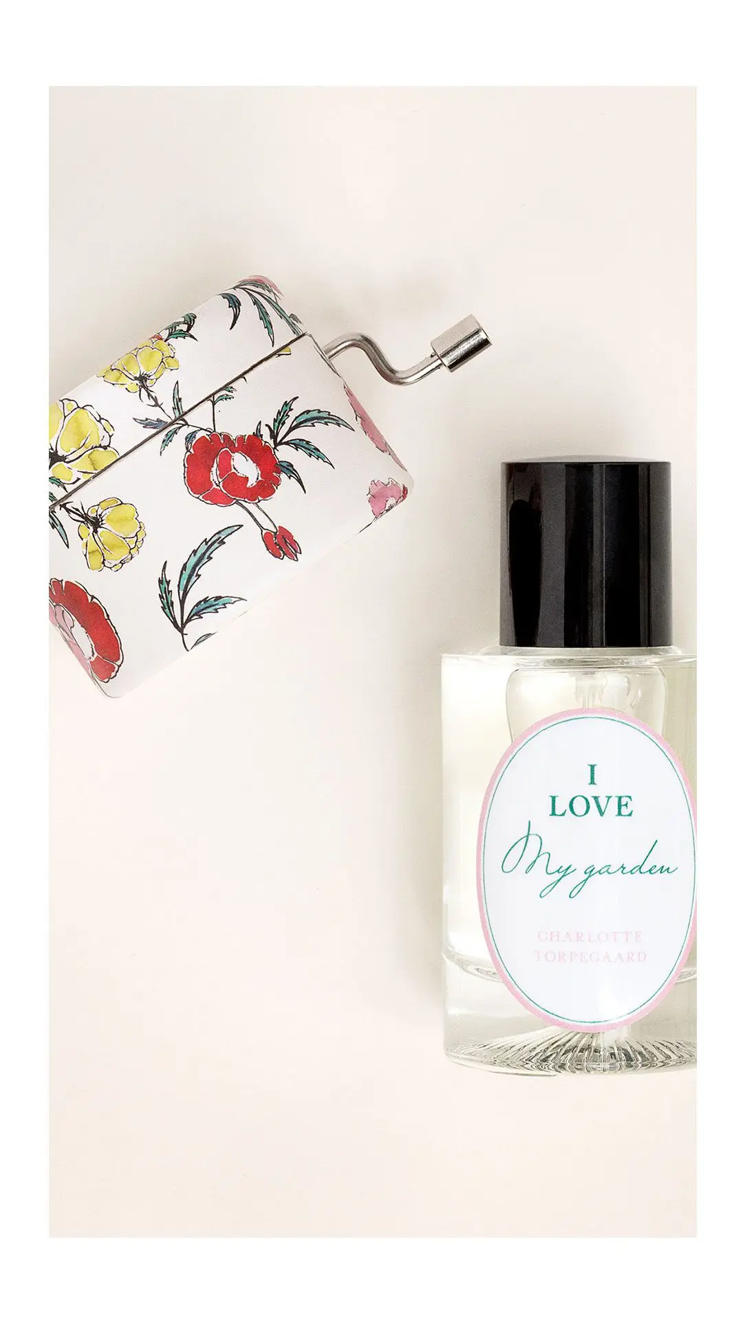 Vi har nemlig fået håndlavet den fineste spilledåse med vores eget blomsterprint som du eksklusivt får med som gave, når du køber vores I LOVE MY GARDEN-parfume (så længe lager haves). Spilledåsen spiller La Vie en Rose (but of course) og printet er håndtegnet af Helene Blanche.