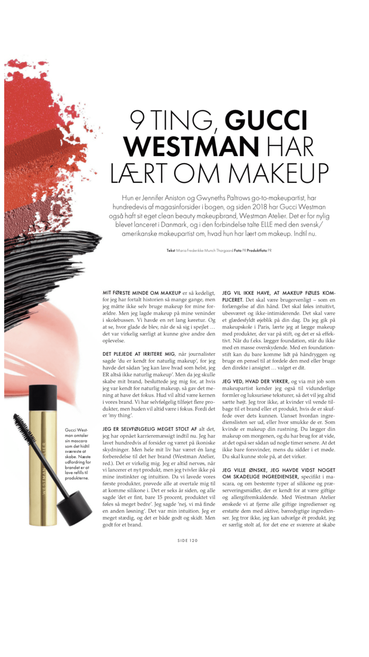 Dér finder du, blandt meget andet dejligt læsestof, det fineste interview med Gucci Westman, der står bag vores nye (og må jeg tilføje, yderst populære) nye makeuplinje Westman Atelier. ELLEs skønhedsredaktør fangede Gucci i Los Angeles lige midt mellem en skydning med Jennifer Aniston (der ikke vil have lagt makeup af andre end Gucci) og en skydning af Westman Ateliers efterårsprodukter (glæd dig!).