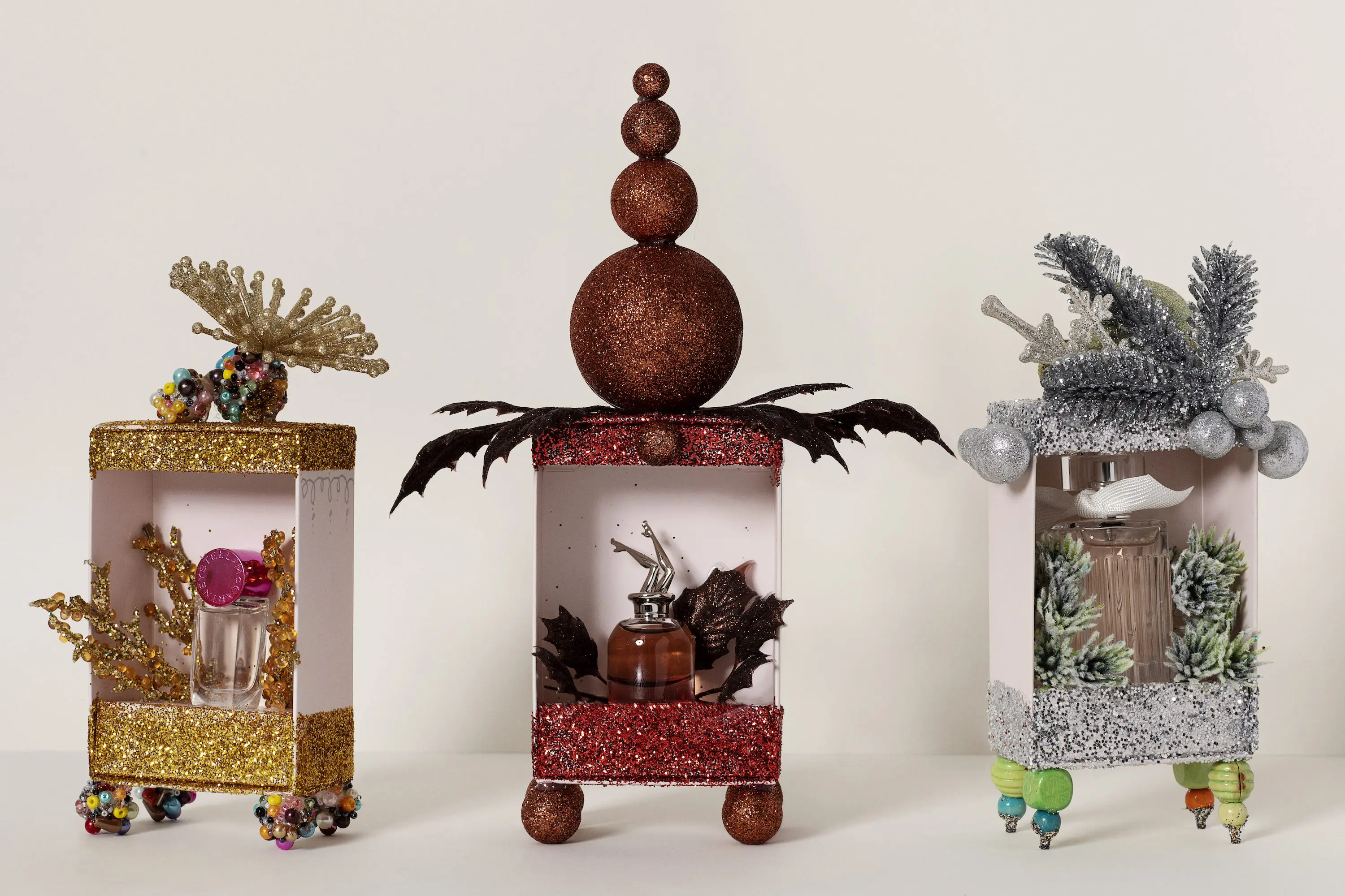 I år har Shane og jeg udvidet samarbejdet. Rigtig mange af jer ville gerne købe parfumejulepynten sidste år, og derfor har vi lavet en lille limited edition kollektion af skønhedsjulepynt som vi sælger i pavillonen. Det er en blanding af gamle parfumeæsker, fine små miniatureparfumer (tjek Jean Paul Gaultiers fine version med dameben, der stikker op eller Marc Jacobs’ fine Daisy-blomst) og Shanes fantastiske gemmer af glitter og pynt, selvfølgelig krydret med den særlige I LOVE BEAUTY-glimmer. Shane kalder dem for små mexikanske julealtre – jeg bliver mindet lidt om min nylige yogatur til Marrakesh. Alle er nummererede og signeret med en personlig hilsen fra Shane.