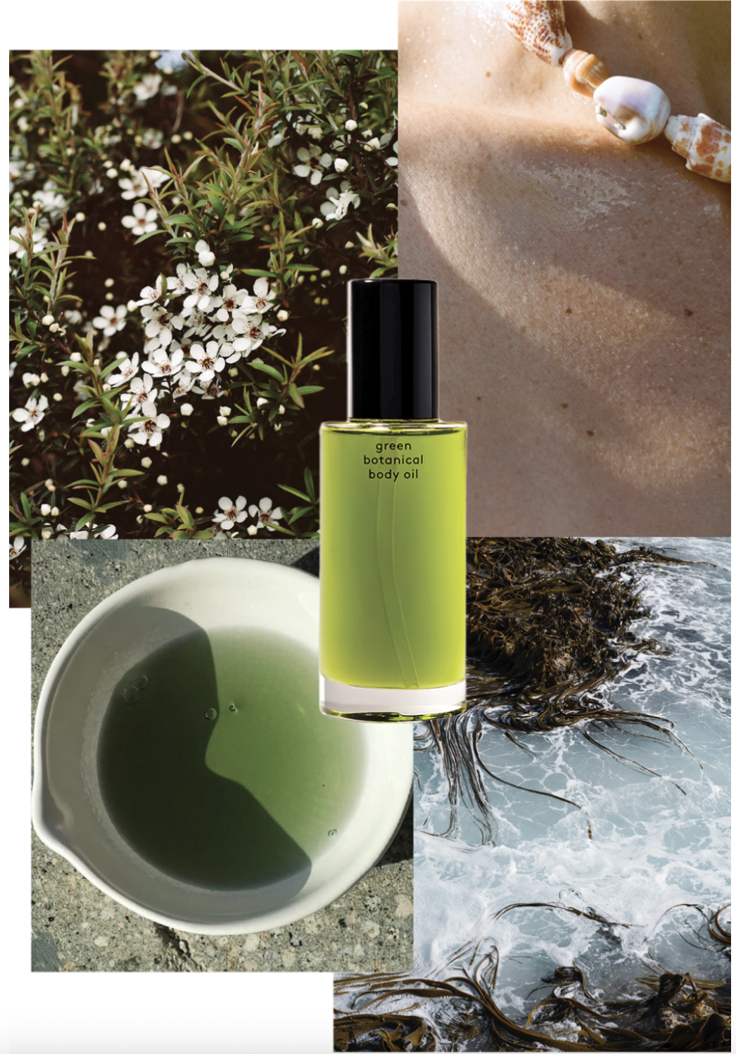 Kropsolien efterlader sund glød og den fineste duft af Manuka-træ, grøn mandarin, sød appelsin, tomatblade, balsamgran og bivoks – opfriskende, grøn og nærmest saftig.