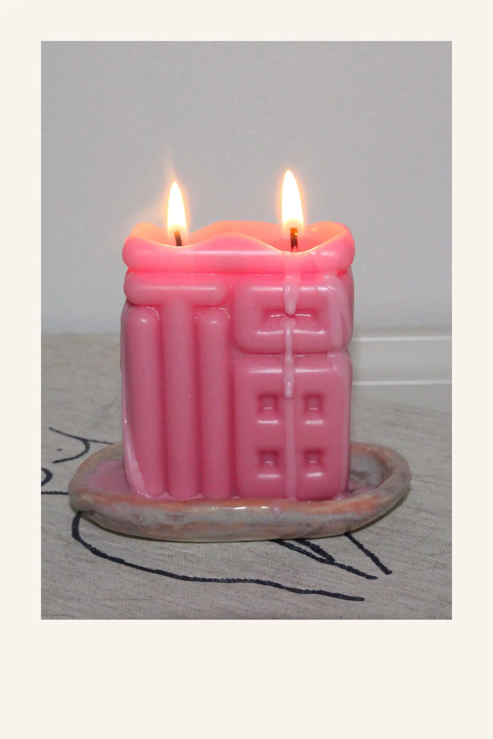 Og så gør det jo ingenting at at det er smukt at se på med sin klare pink farve og fint svungne form. Lyset kommer indpakket i smukt printet papir og har to væger, så det kan brænde symmetrisk ned. Det dufter mildt af den sojavoks, det er fremstillet af, og der er ikke tilsat yderligere duft.