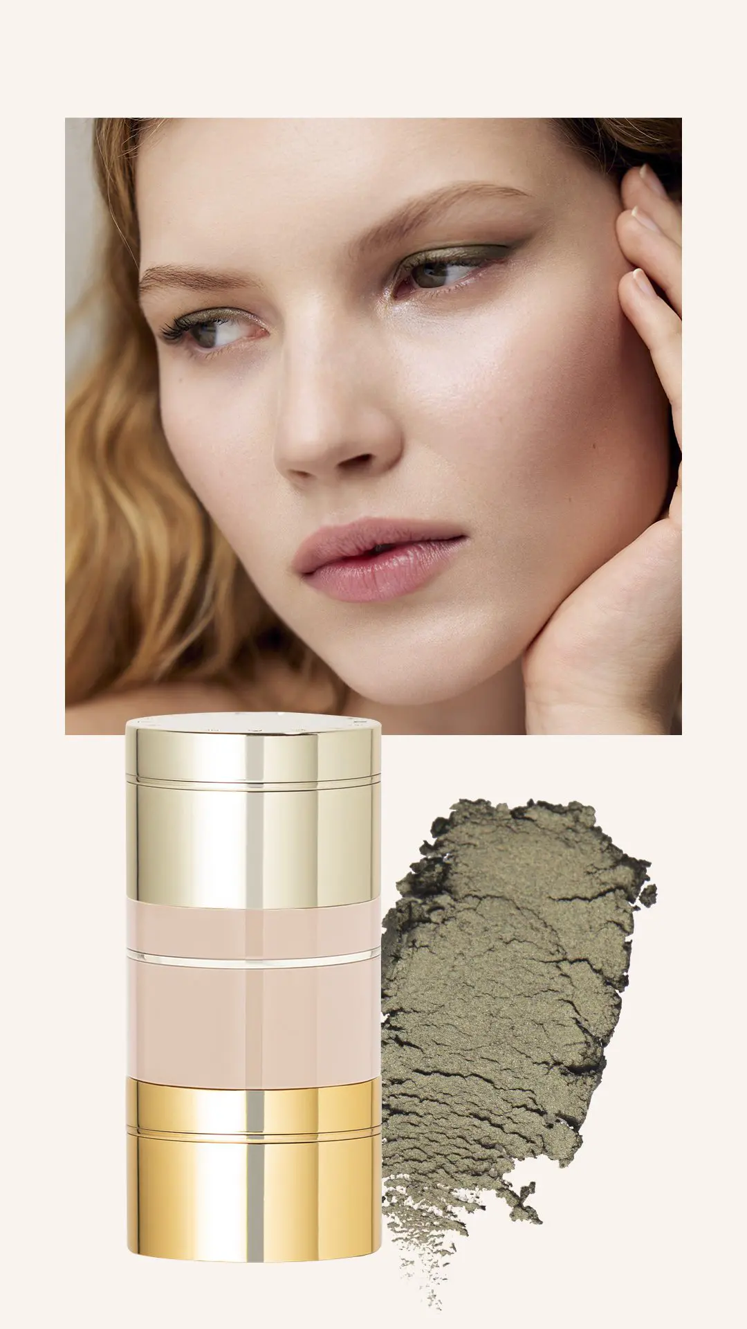 Vi taler en rose-ferskentone (virkelig fin!) til at highlighter og bruge i øjenkrogen for at åbne øjet; en støvet, smuk khakigrøn (billedet her siger vist alt) og en kølig brun, som også er perfekt at bruge langs vippekanten som en blød version af eyeliner.