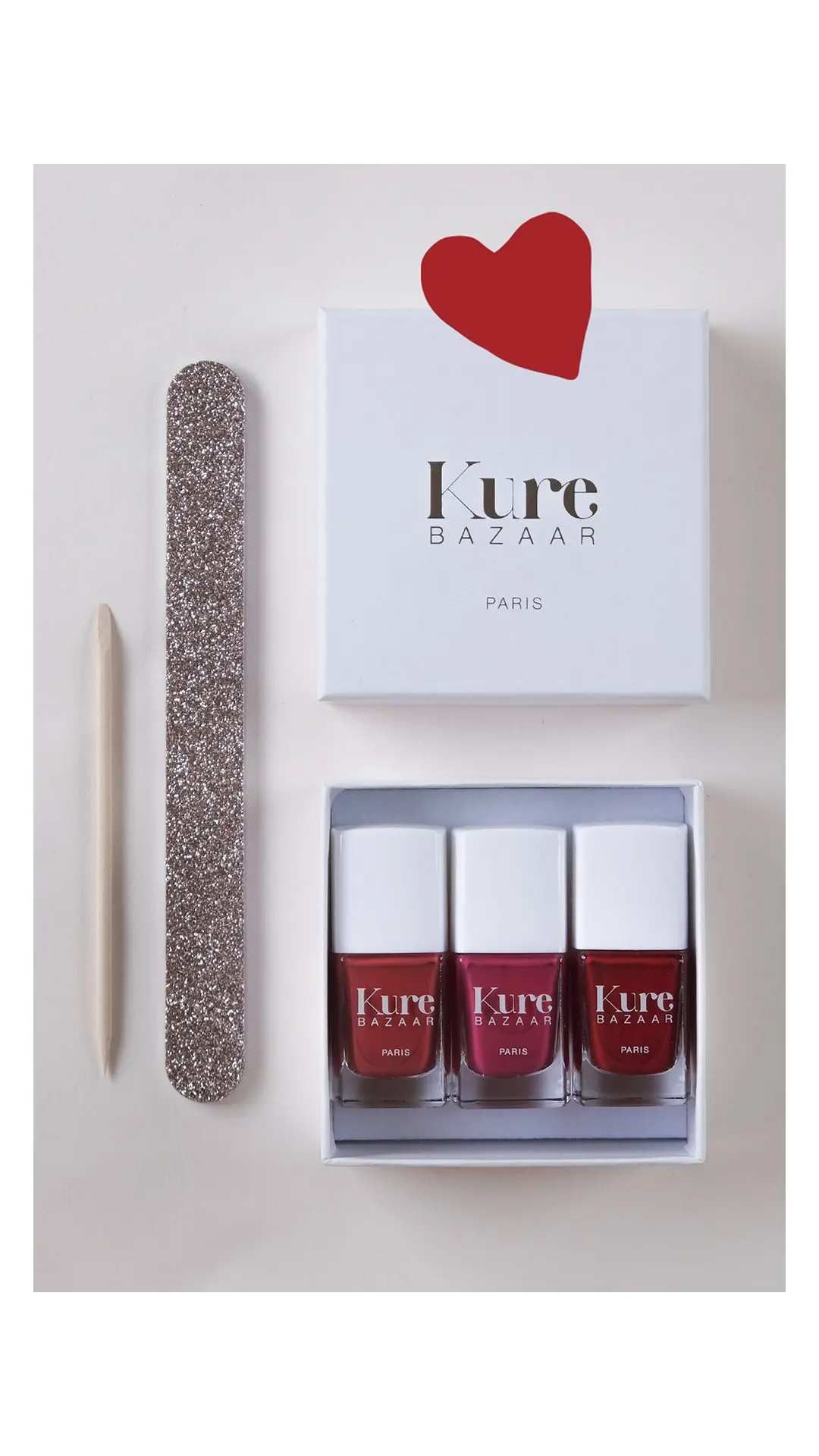 Here is the deal: Du køber 3 Kure Bazaar-lakker i de farver, du holder allermest af (Clean Base Coat og Dry Finish Top Coat tæller selvfølgelig også med i de tre, hvis du gerne vil have et helt sæt og lad os bare sige, at du har ikke prøvet en god basecoat før du har prøvet Clean), og så pakker vi dem smukt i den fine Kure Bazaar-æske akkurat som den, du får i Paris og – for det er nemlig ikke det hele – akkompagneret med Kure Bazaars professionelle rosenpind og den yderst eftertragtede glitterfil, som er Kure Bazaars professionelle neglefil (verdens bedst fil, hvis du spørger os) strøet med det fineste glitter.