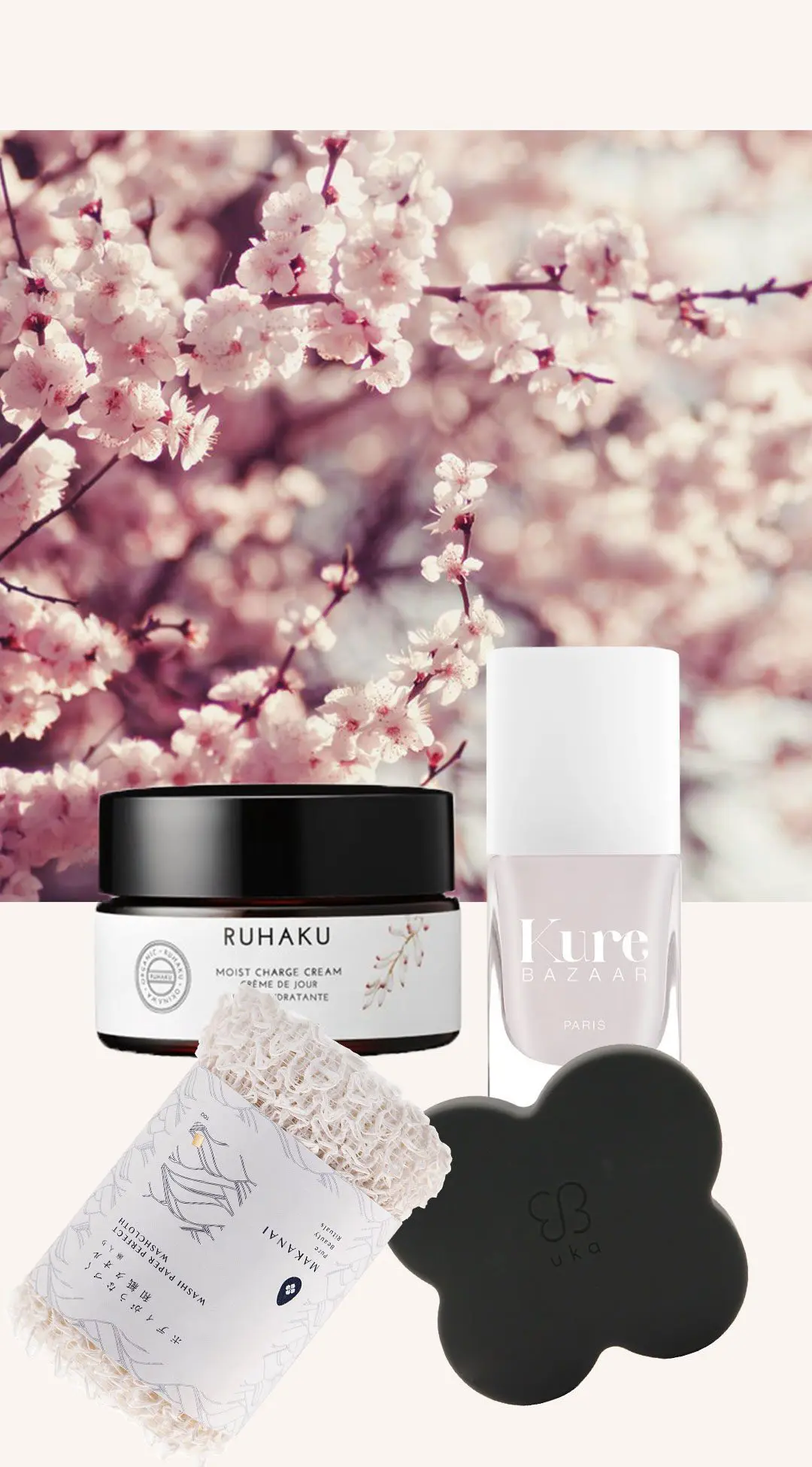Kenzan-børsten, der er inspireret af de traditionelle japanske kenzans som de bruger til deres fine blomsteropsætninger. Washi Towel som er en vigtig del af det japanske baderitual. Ukas aromaterapeutiske negleolier med dufte, der balancerer hele din dag. Den fine japanske Yuzu-frugt der stimulerer alle sanser og blandt andet findes i denne økologiske tandpasta. Og Kimono-neglelakken i den fineste hvide farve med et touch af rosa, akkurat som en traditionel japansk kimono. Eller Fuji, der har samme farve som landskabet rundt om det hellige japanske Fuji-bjerg.